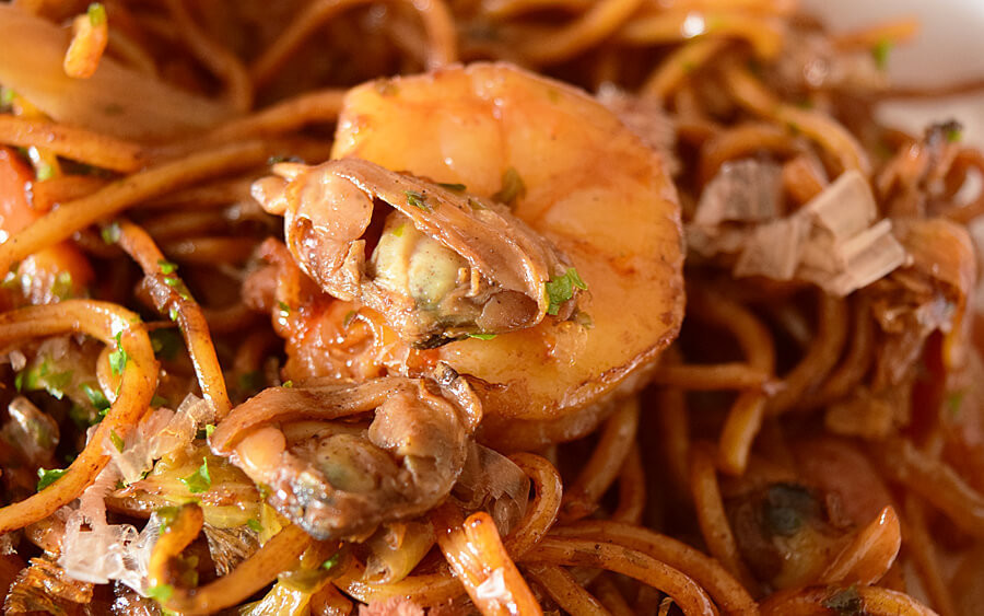ソース焼きそばですが、エビやあさり、ちいさなホタテなどが入っていて、魚介類が入っていますね。味自体はソースがベースですが、魚介系の香ばしい味わいも混ざっています。