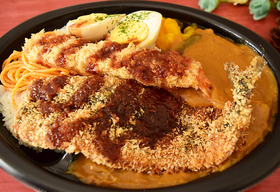 大きなえびフライとさんまフライが顔を出すタカマル鮮魚店「魚屋のカレーライス」538円(税込)。