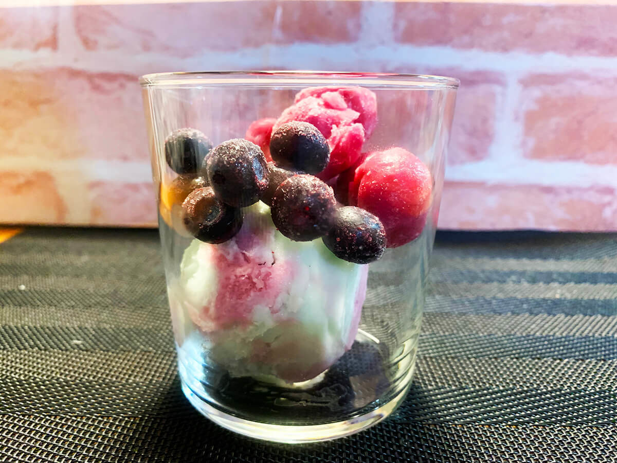 写真は、アイスクリームにデコレーショをして作った子どもたちのおやつです。シンプルながらスタイリッシュなデザインなので、なんだか素敵なデザートに見え、手抜きがごまかせて助かっています。