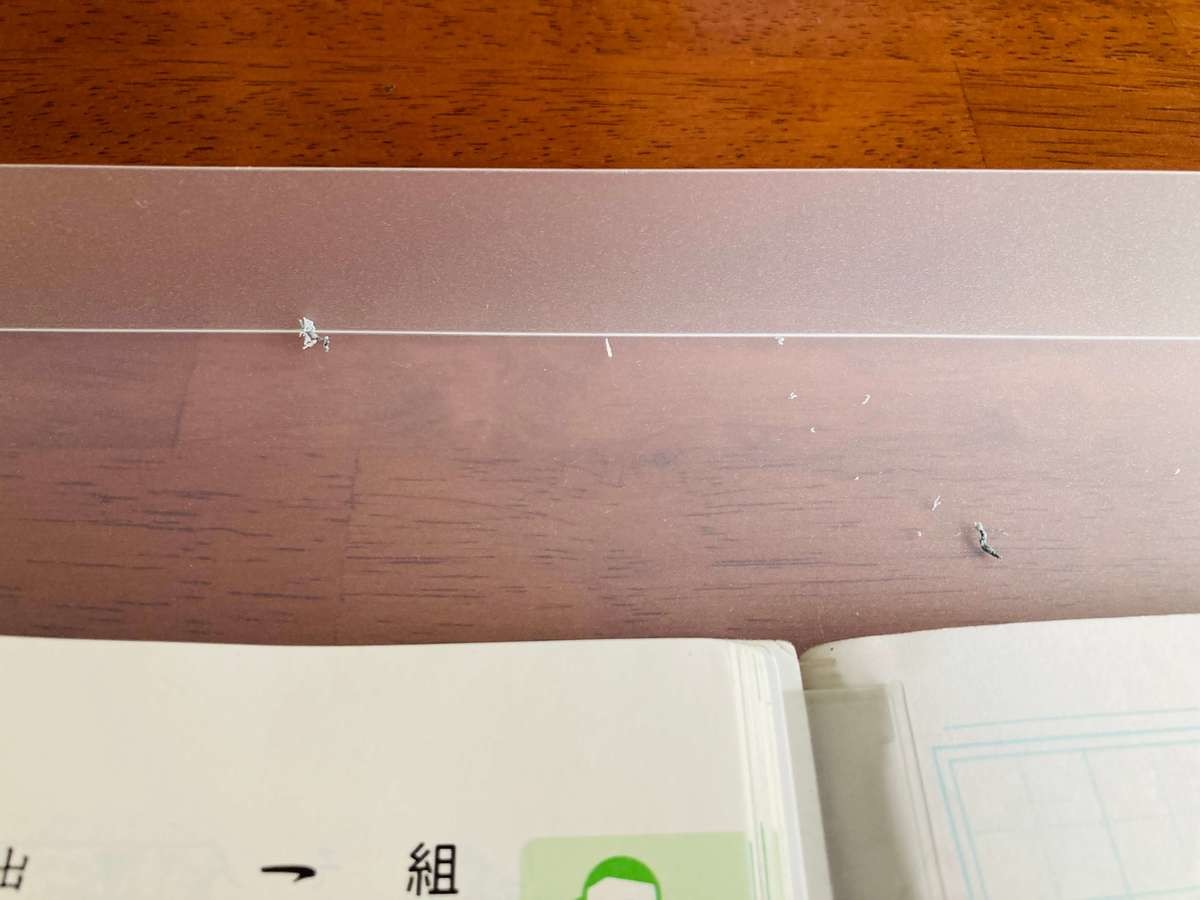 ノートと教科書を置いてみると、開いたノート1冊分を置けました!真ん中に置くと左右に3~4cmくらいのスペースがあるので、手を置いてもじゅうぶんに作業スペースがあります。