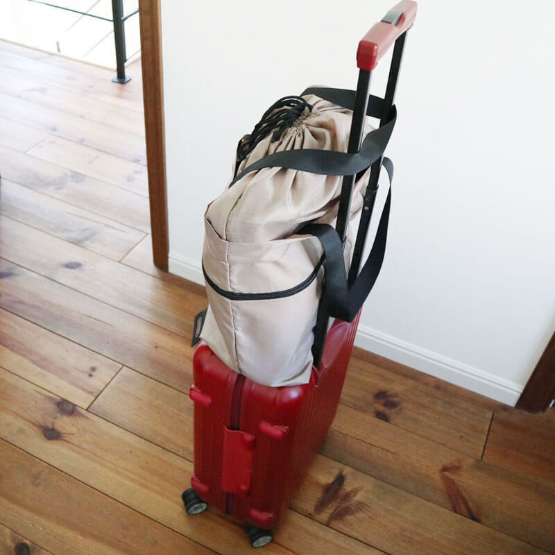 このバッグは折り畳んでおけばスーツケースにもかさばらず収納でき、買いすぎても拡張可能なので安心です。