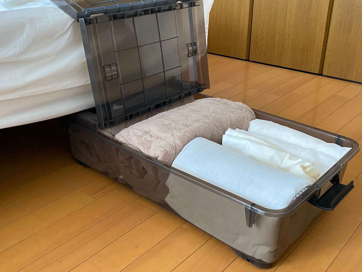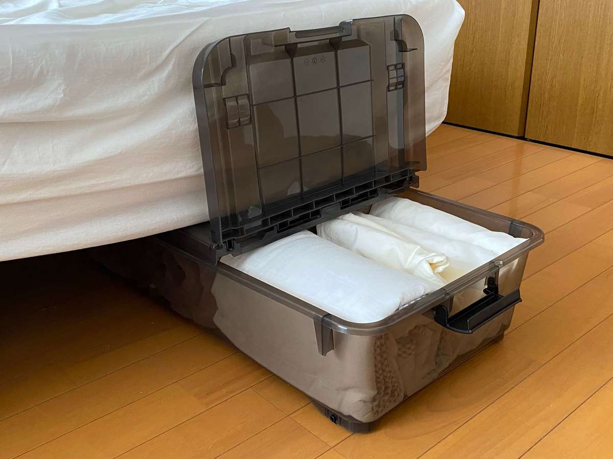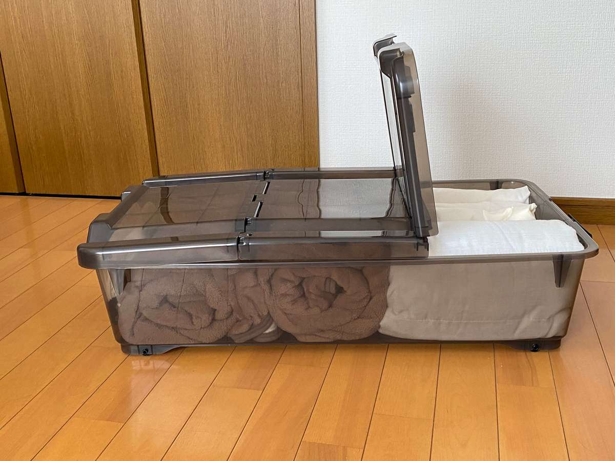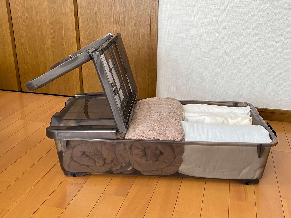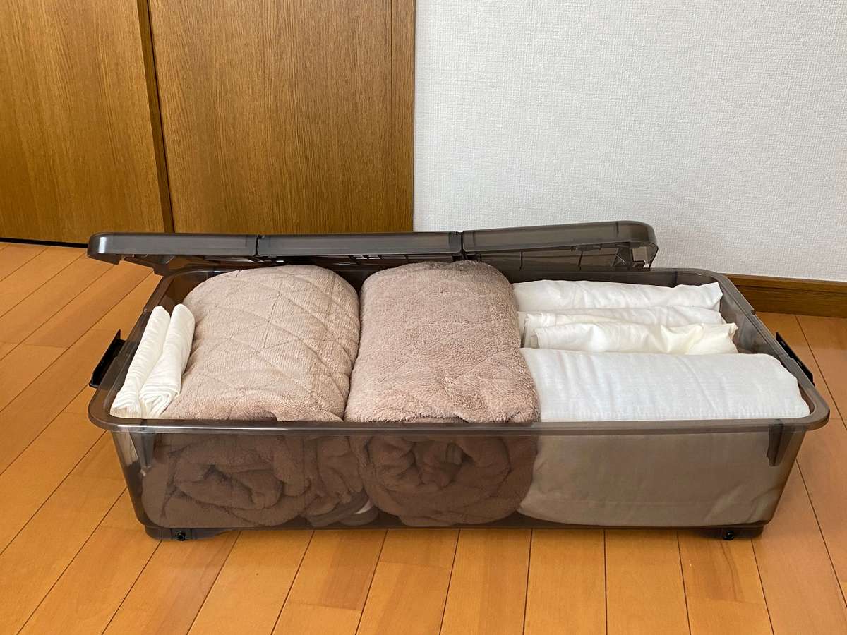 我が家では、「キャリコオレア」に寝具を収納しています。