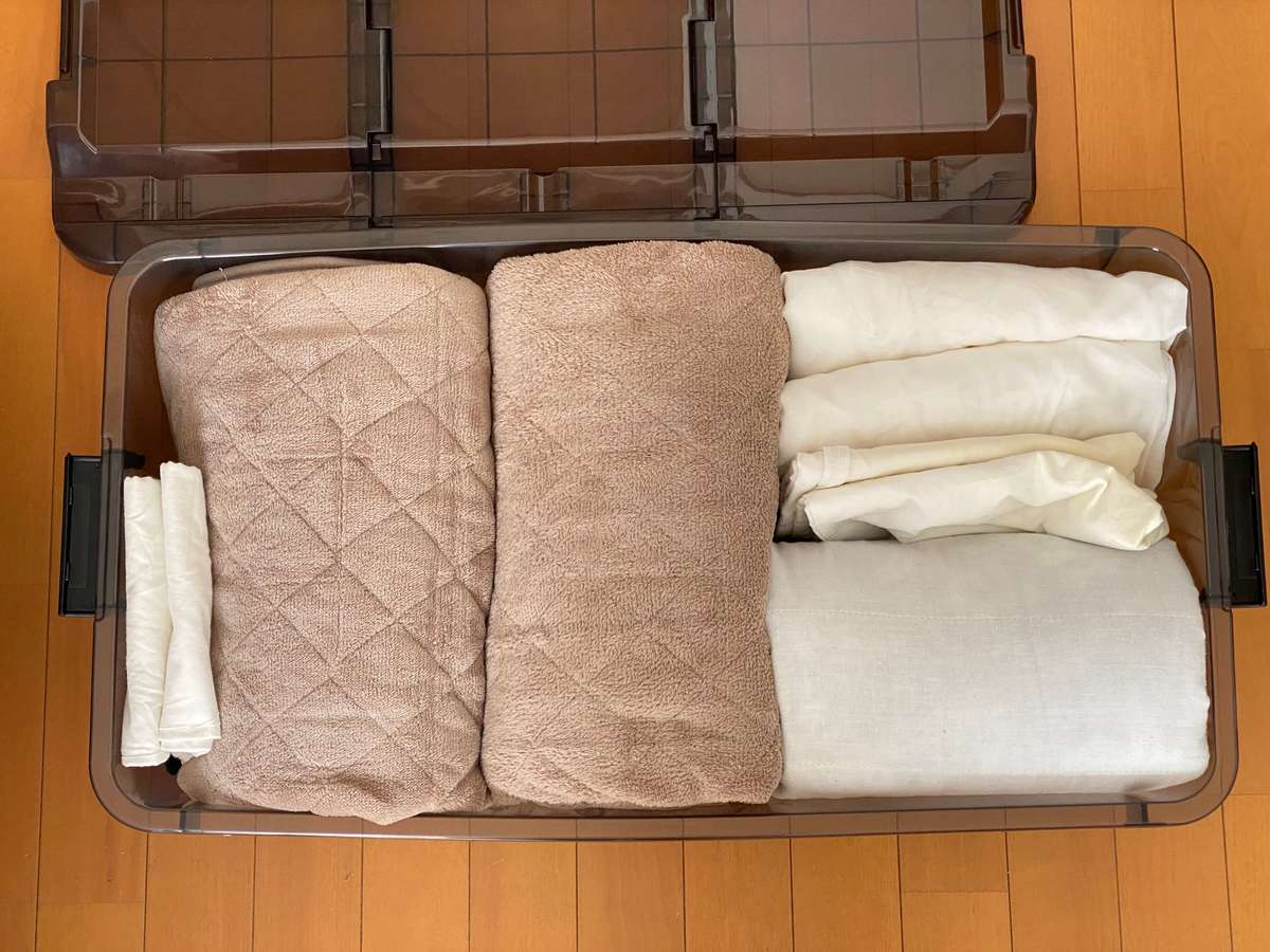 衣替えをする際は、収納するケースの向きを変えるだけでOK(奥に薄手のシーツ、手前に厚手のシーツ)なので、手間も時間も削減できますよ。