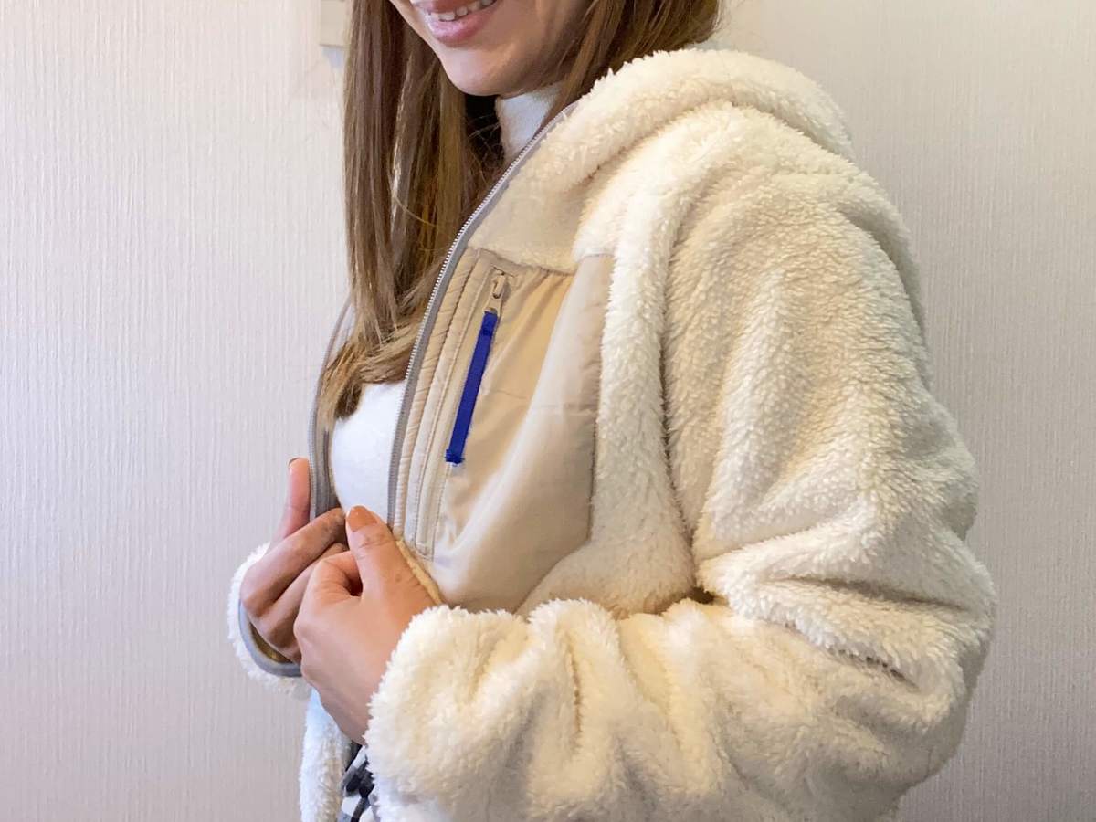 冬のアウターは着膨れしがちですが、「防風ダブルボアフーディー」はシルエットがスッキリしているため、着膨れしにくいのが嬉しいです。