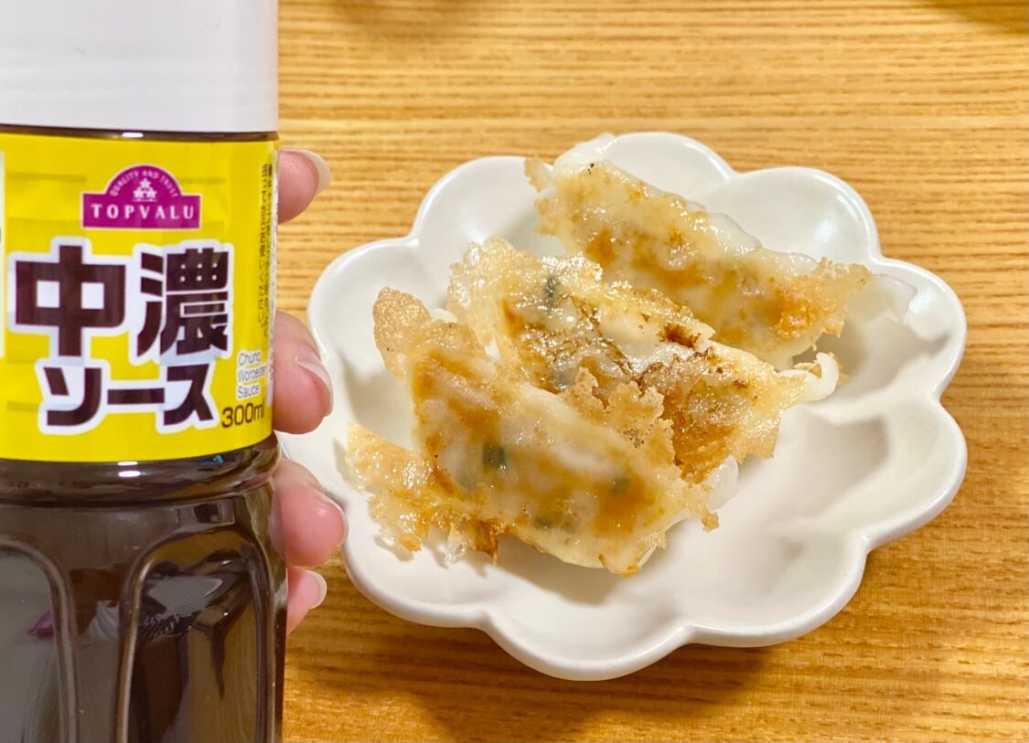 どんな味か気になるので、さっそく餃子を焼いてみました!それでは、中濃ソースをつけて食べてみたいと思います♡