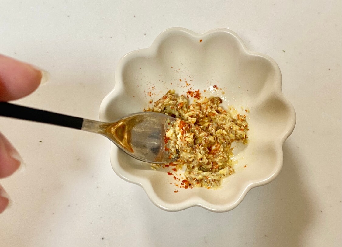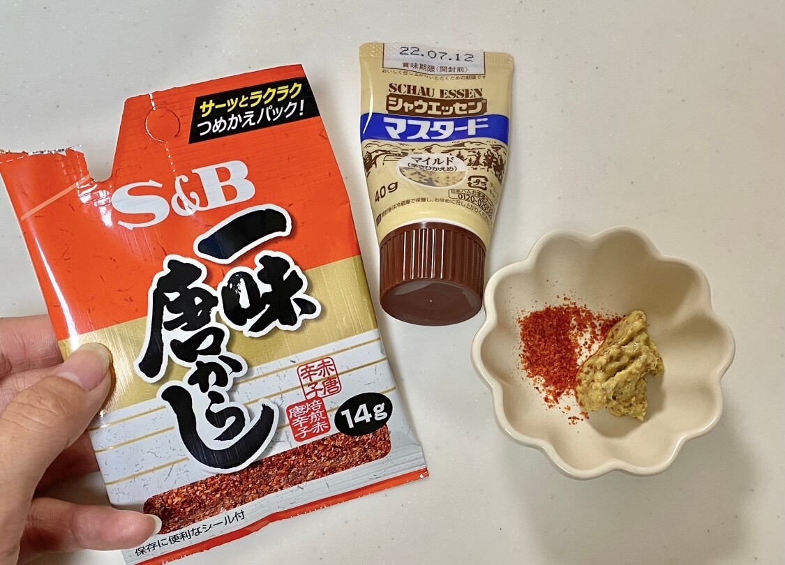 使うのは、こちらもご家庭にある調味料の"マスタード"と"一味唐辛子"。