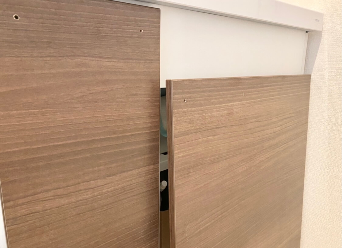 貼り終わったら、扉や取っ手を元通りに戻して完成!ヘリンボーンの木目が優しく、洗面所の雰囲気が柔らかい印象に変身しました♡