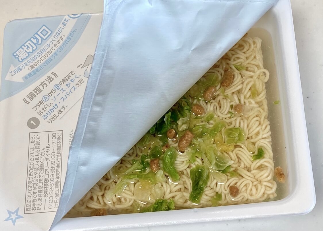 まずはいつも通り、ソースの袋を取り出し、麺と具材(かやく)にお湯を注いで戻します。