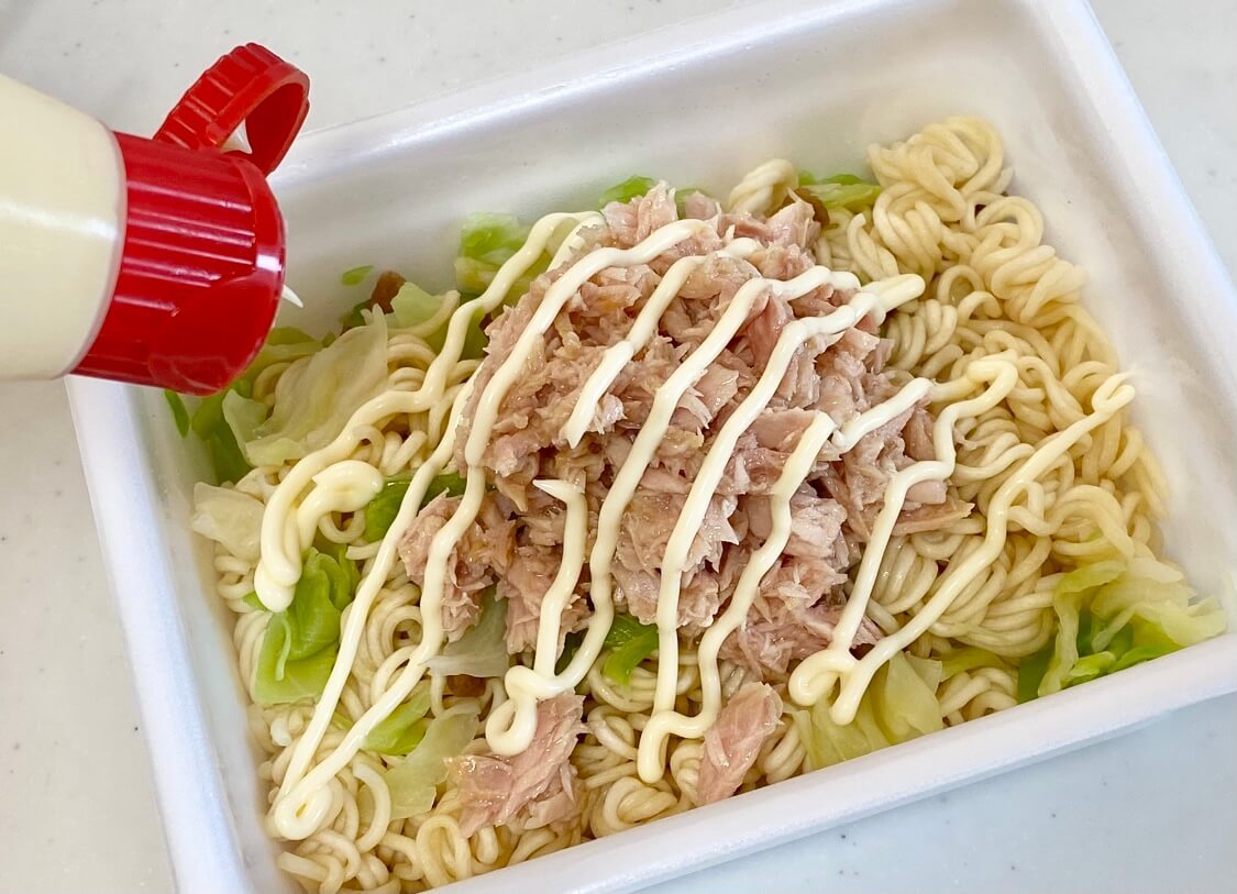 マヨネーズを好きなだけたっぷりかけていきます。カップ焼きそばにツナマヨって...これ絶対美味しいやつ...!