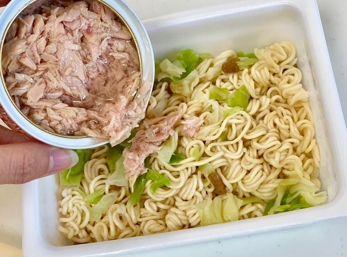 湯戻しした麺と具材(かやく)に、ツナ缶をオイルごと入れます。マツコさんいわく「ツナ缶のオイルには、ツナの味が凝縮されている」そう。