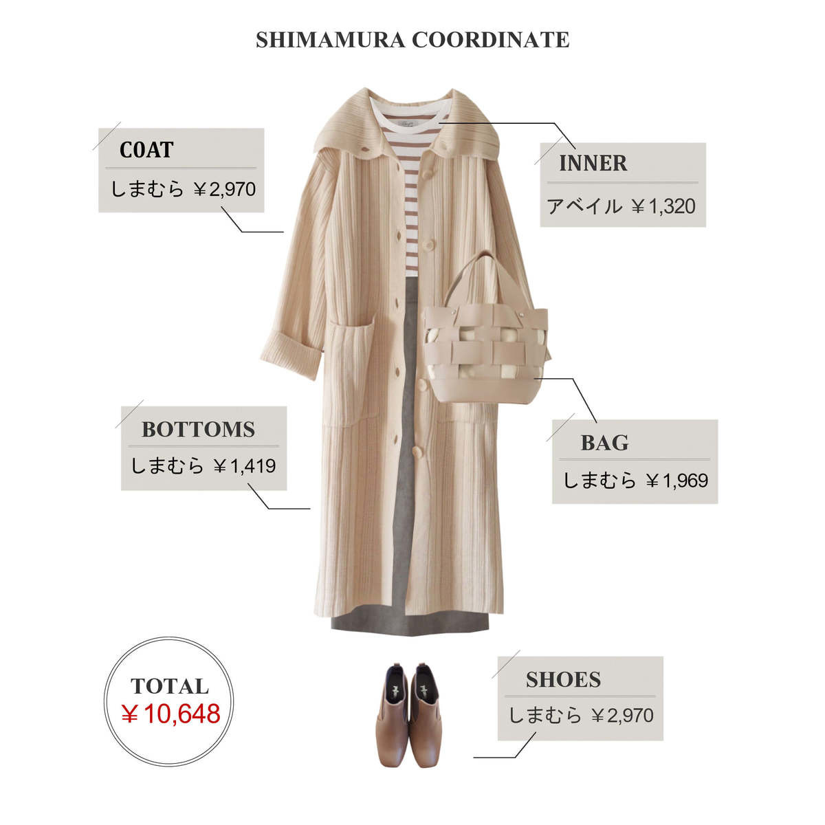 今回は、しまむらで見つけたニットコートで4パターンのコーデを考えました。