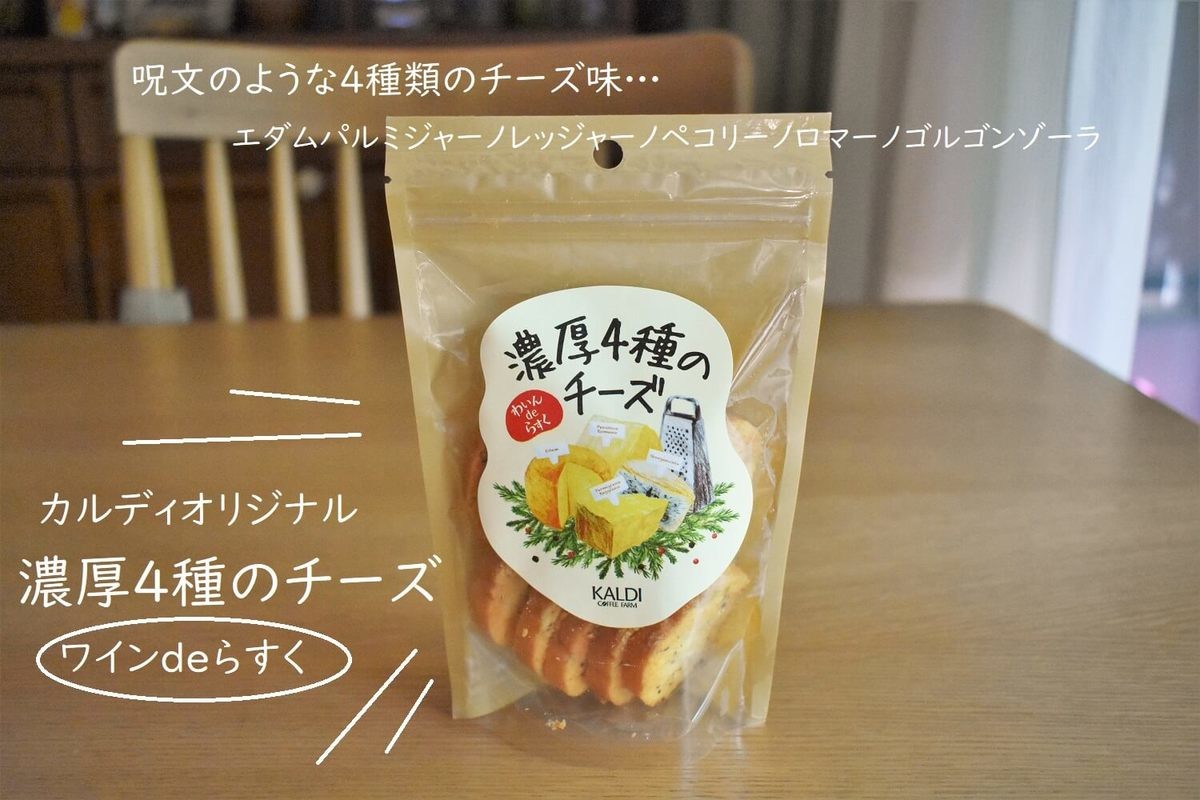 こちらはカルディオリジナル商品の「濃厚4種のチーズ わいんdeらすく」です。商品名のとおり「ワイン」にあうおつまみのようですが、筆者はビールにあわせます。