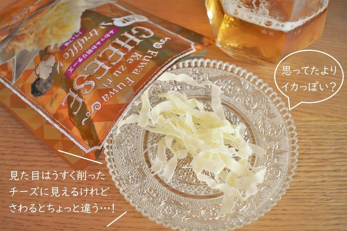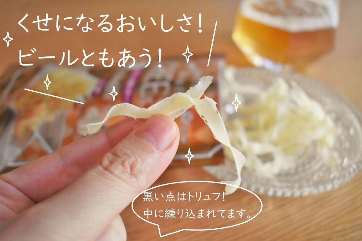 食べてみると、まずトリュフの香りがふーんと広がります。その歯ごたえは、チーズより少しイカに似たしっかりした噛み応え。噛みしめるほどチーズの旨味もでてきます。