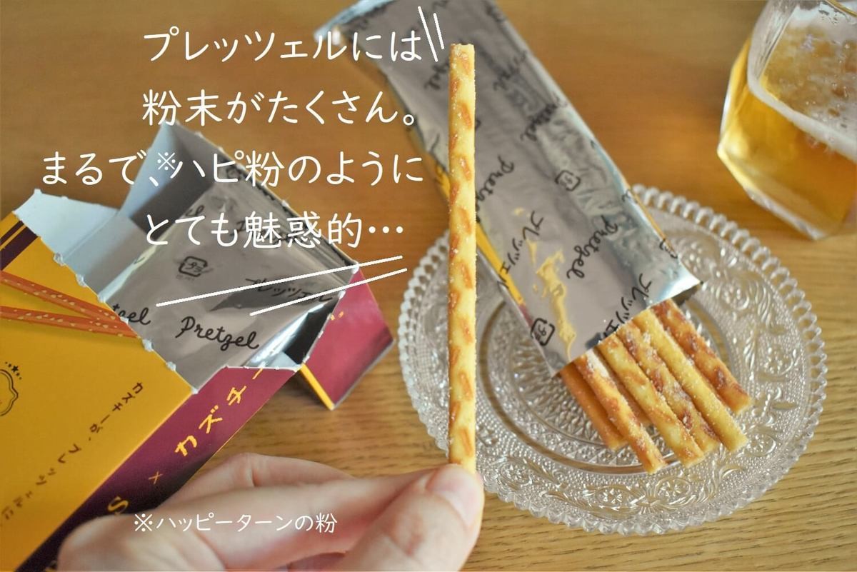 口に入れるとザクザクとした歯ごたえ。プレッツェルについているパウダーが、まるでハッピーターンの粉のようにたくさんついていますが、しつこくはありません。