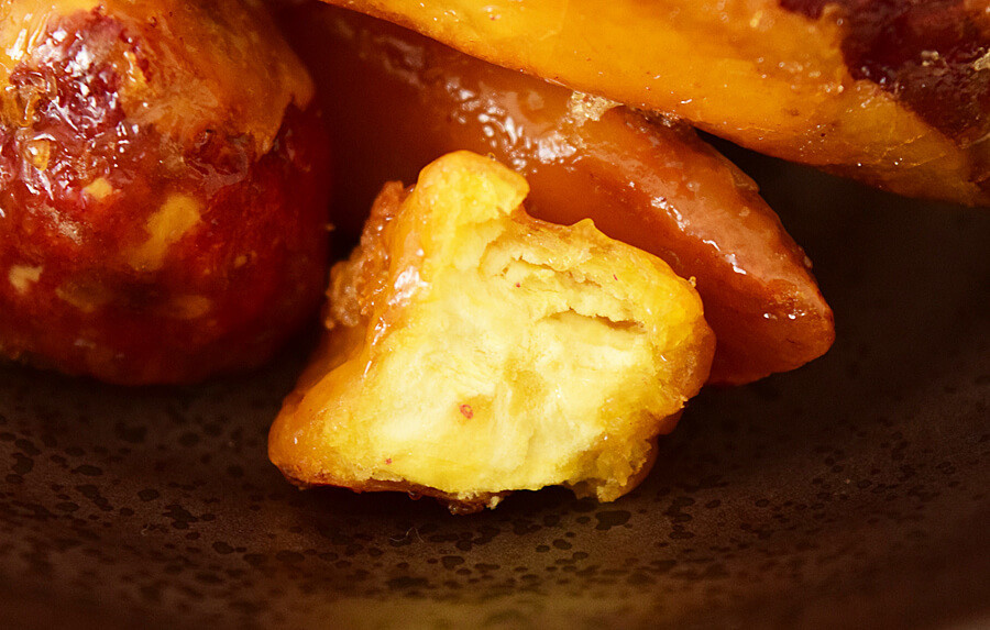 表面が密がカリカリ食感に、芋もやや固めでシャリっとしていて、アイスクリームを食べているかのようです。甘みは感じられるものの、甘ったるくないからしつこくない。