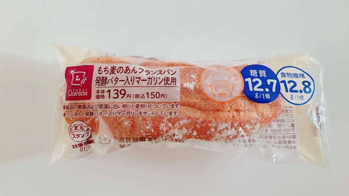 こちらのパン、ローソンの糖質オフパンシリーズの「もち麦のあんフランスパン 発酵バター入りマーガリン使用」税込150円です。