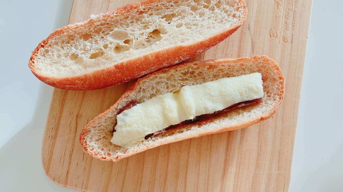 こちらは一個当たりの糖質が7.4g。一個で7.4g、先程のあんフランスと比較すると糖質多め? と感じてしまいますが、いえいえ、中を見てください!インのお供にいかが?