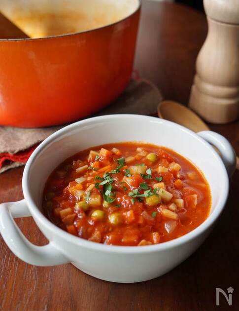 じっくりコトコト煮込んだ基本のミネストローネです。トマトの旨味とたっぷりの野菜を堪能できる贅沢な一品。ご飯を加えてリゾットにしたり、パスタソースにしたりと、アレンジも楽しめます。