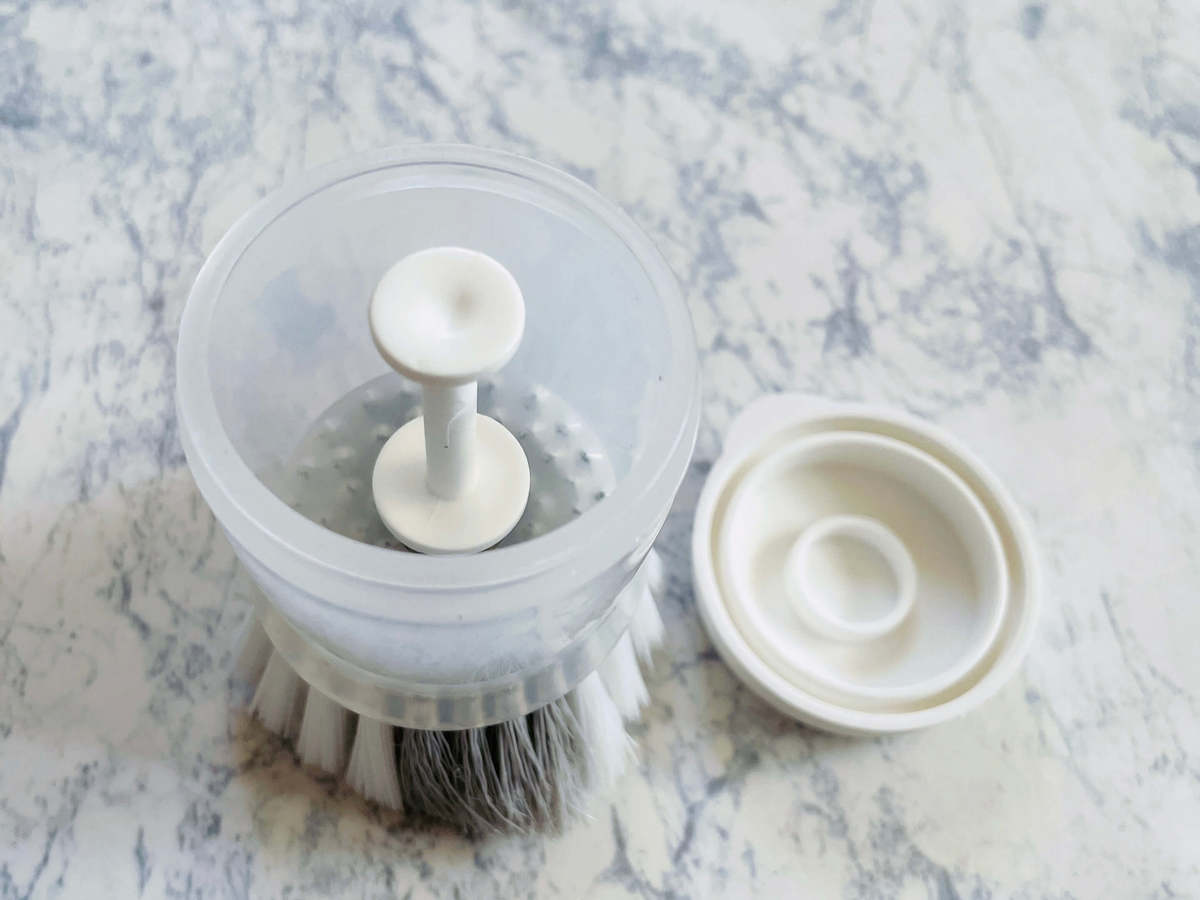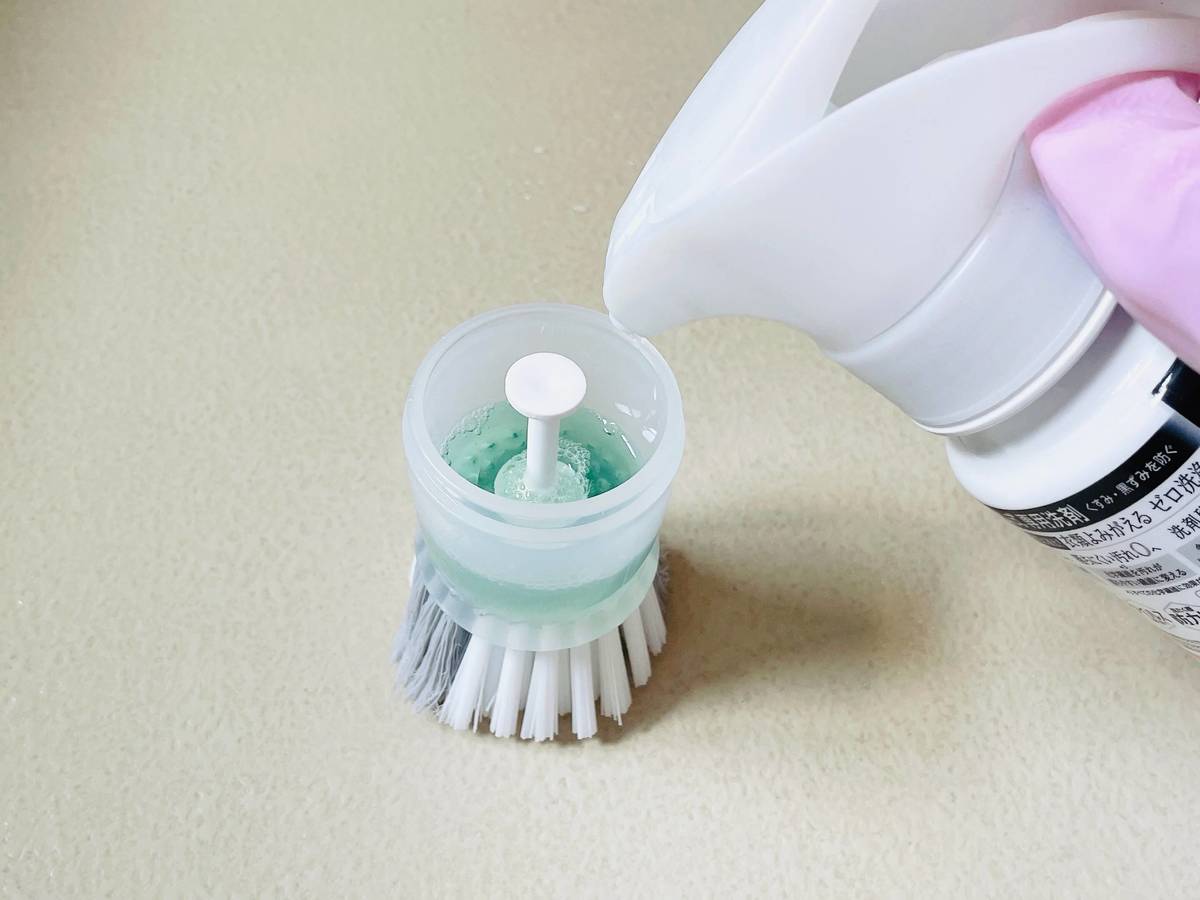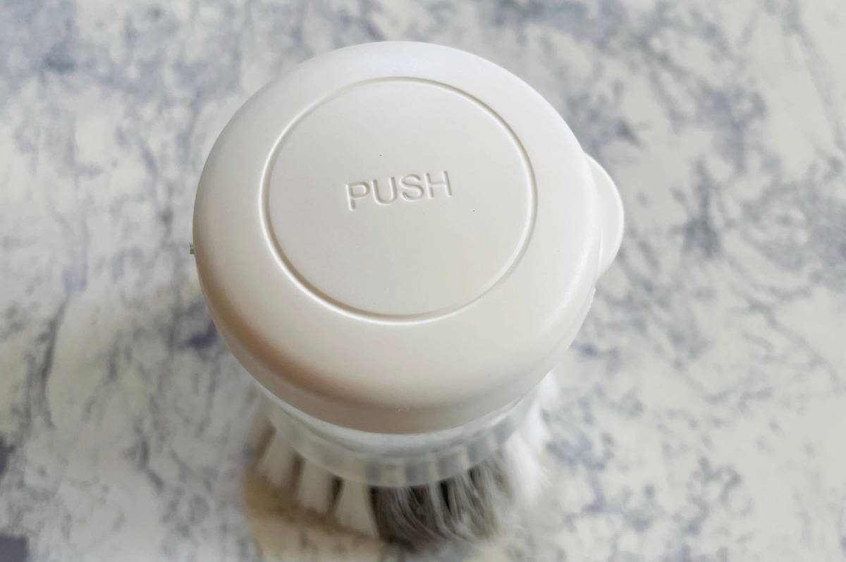 プッシュボタンを深く押すと洗剤がブラシの中央から適量出ました。
