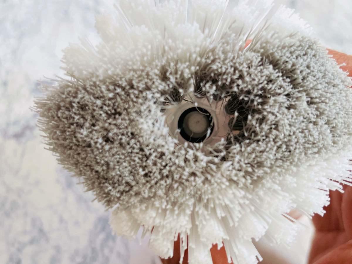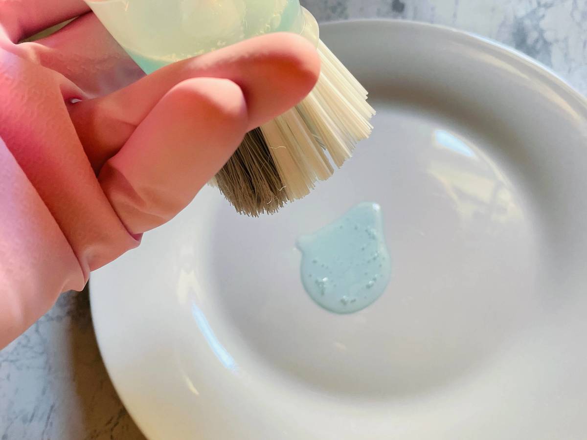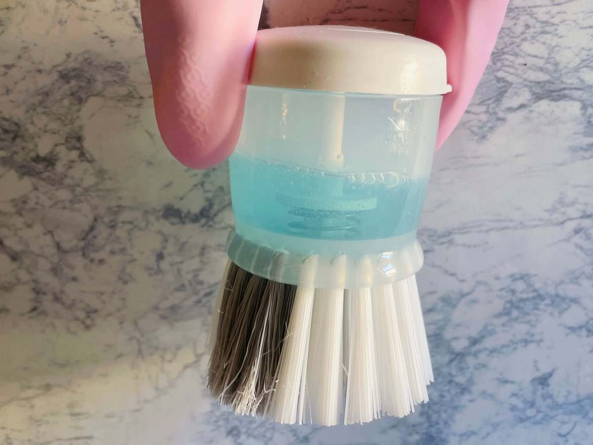 プッシュボタンを深く押すと洗剤がブラシの中央から適量出ました。