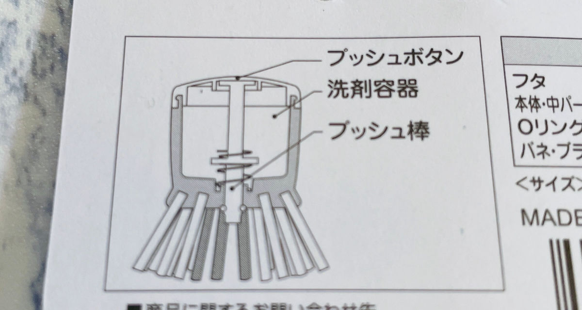 フタの中心部分にプッシュ棒があるので、フタのPUSHの文字を押して洗剤を出します。