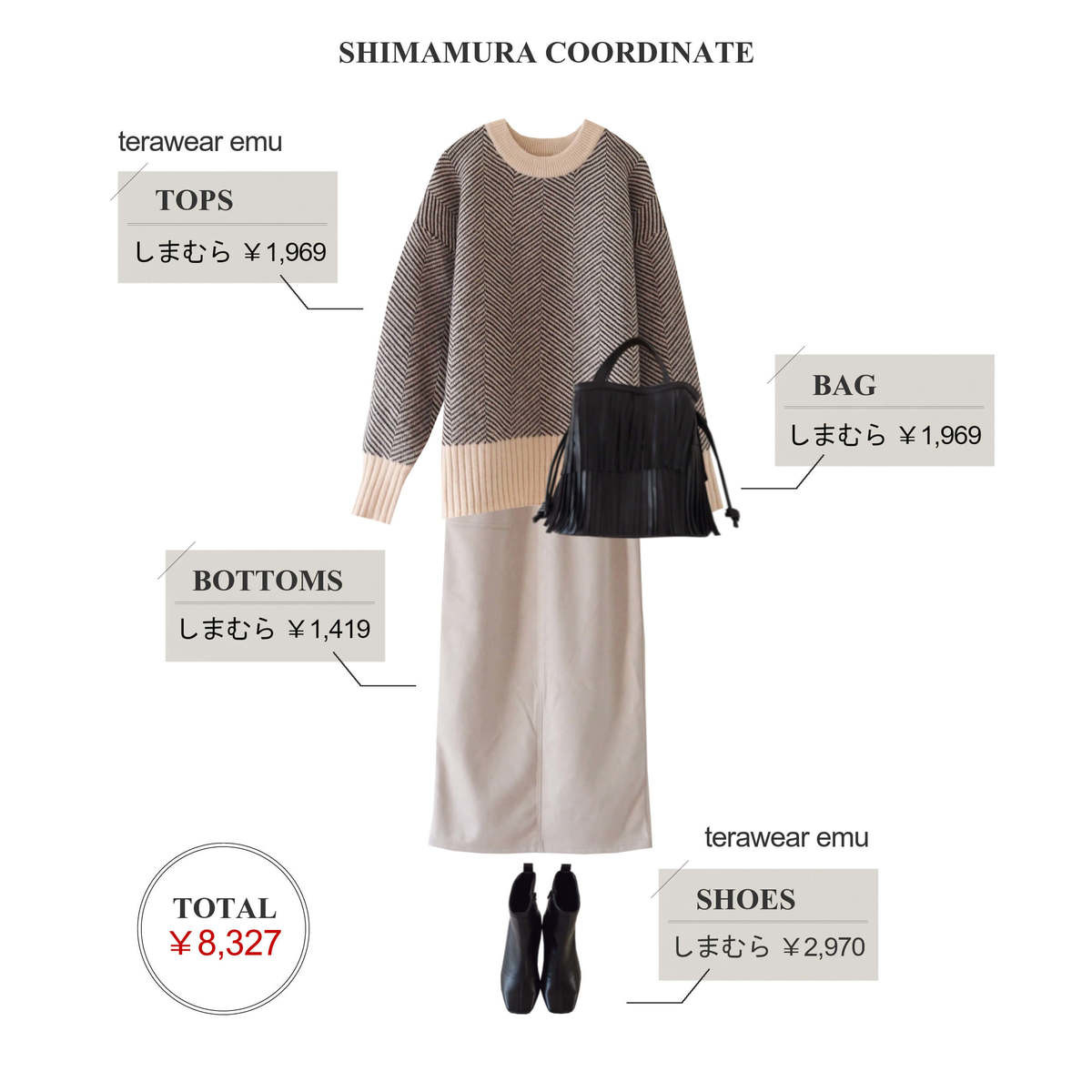 ヘリンボーン柄ニットとタイトスカートできれいめカジュアルコーデ。