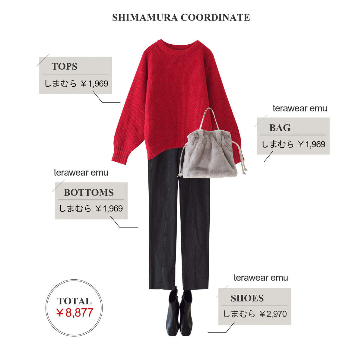 1枚で着映えする赤のニットプルオーバーが、コーデの主役。
