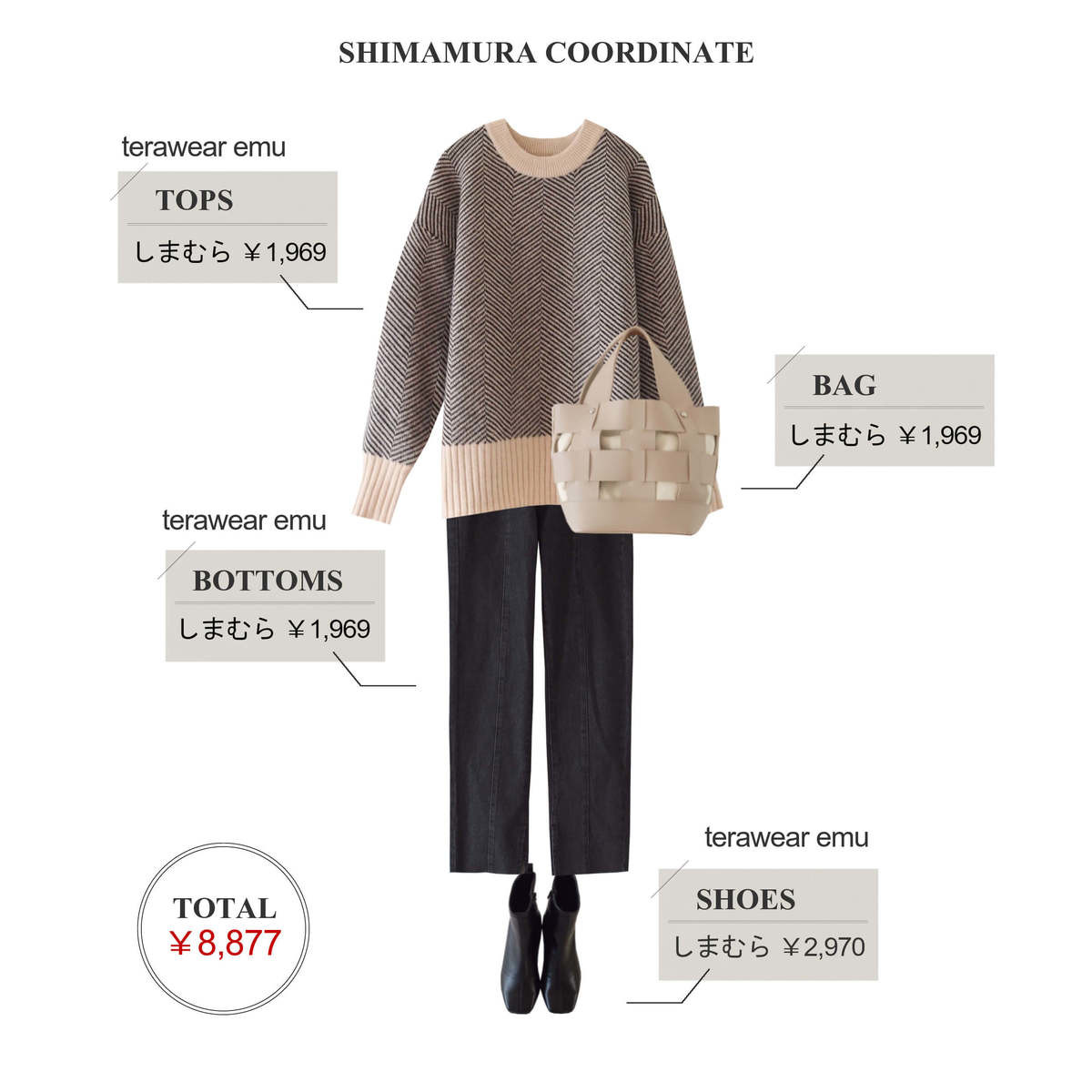 ヘリンボーン柄ニットで大人カジュアルコーデ