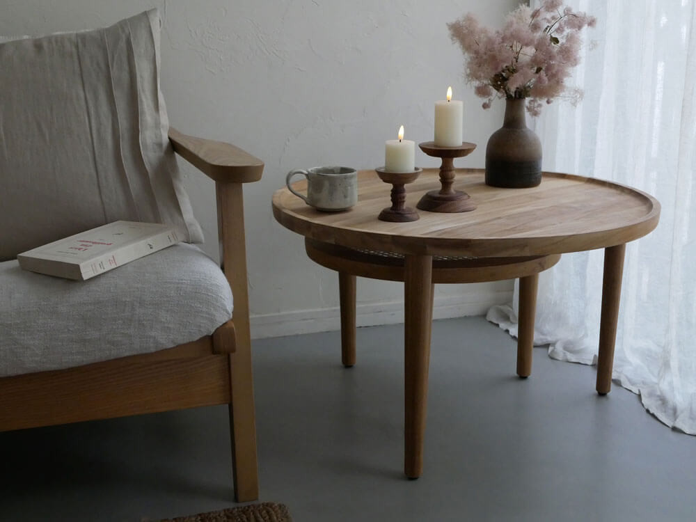 キャンドルの暖色系のゆらめきと「WOOD キャンドルスタンド コンポート」の優しい木目、そしてリッチな雰囲気で心に余裕が生まれてくるよう。