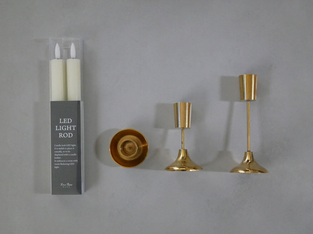 どちらもヴィンテージ感高まる真鍮製。キャンドルの雰囲気も相まって最大限に魅力を引き出してくれますね。