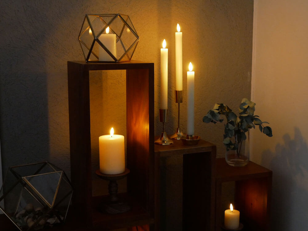 キャンドルは安全なLED、スタンドはシーシャムウッドや真鍮製。幻想的な空間で大人の夜更かししてみませんか?