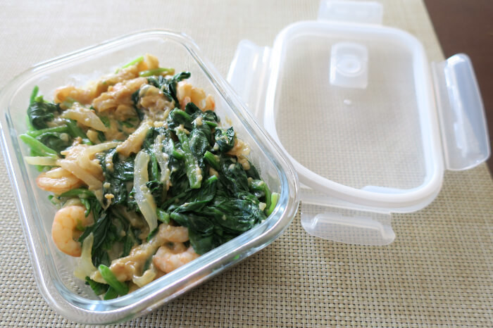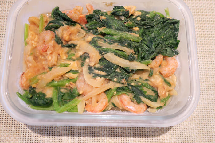 さっそくほうれん草と海老のグラタンを作りおきしてみました。具材をいためて容器に入れ、冷凍します。