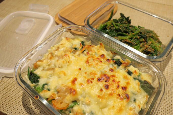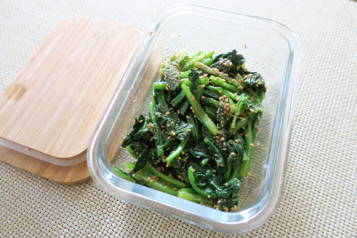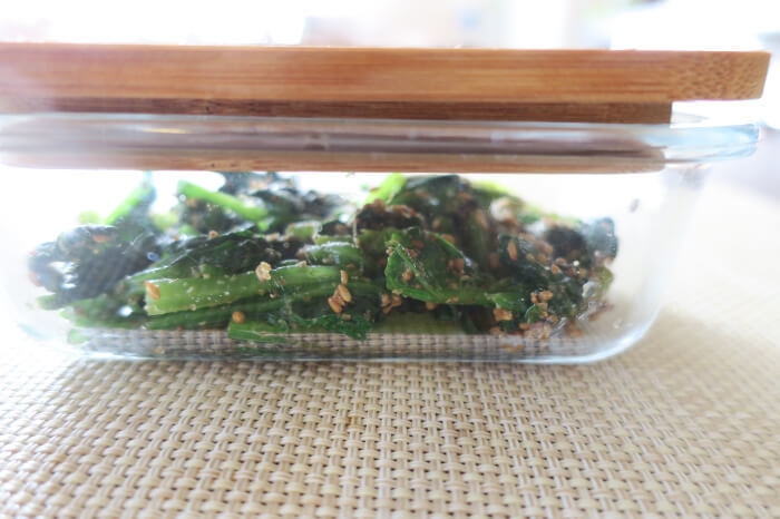 グラタンの残りのほうれん草を胡麻和えにして入れてみました。かわいいので蓋ごと食卓に出したくなりますね…!