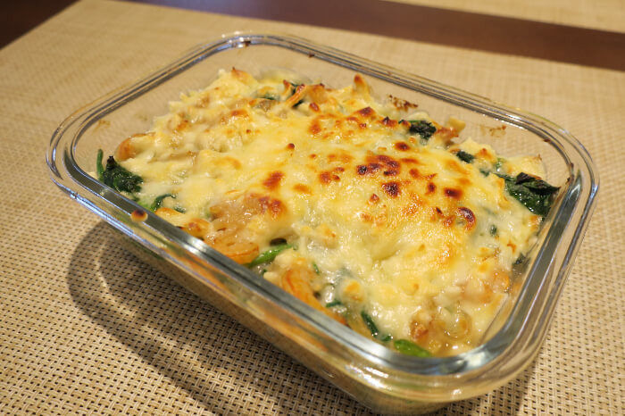 チーズが溶けておいしそうなグラタンが完成!ガラス容器なのでそのまま食卓に出してもおしゃれなのが嬉しい!