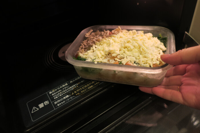 そのまま蓋を取り、溶けるチーズを乗せて、オーブンへ入れます。