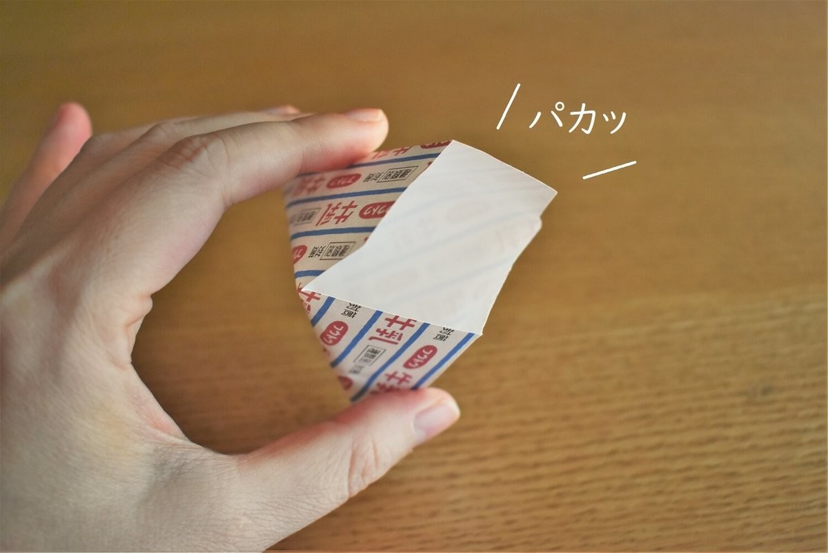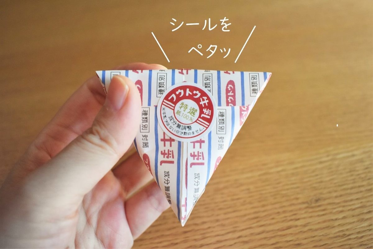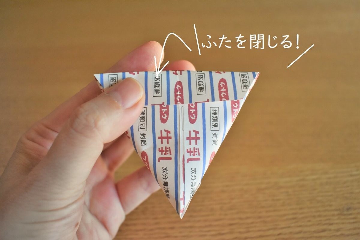 端と端をあわせると三角になるので、上にぴろんと出ているフタを下に折ります。