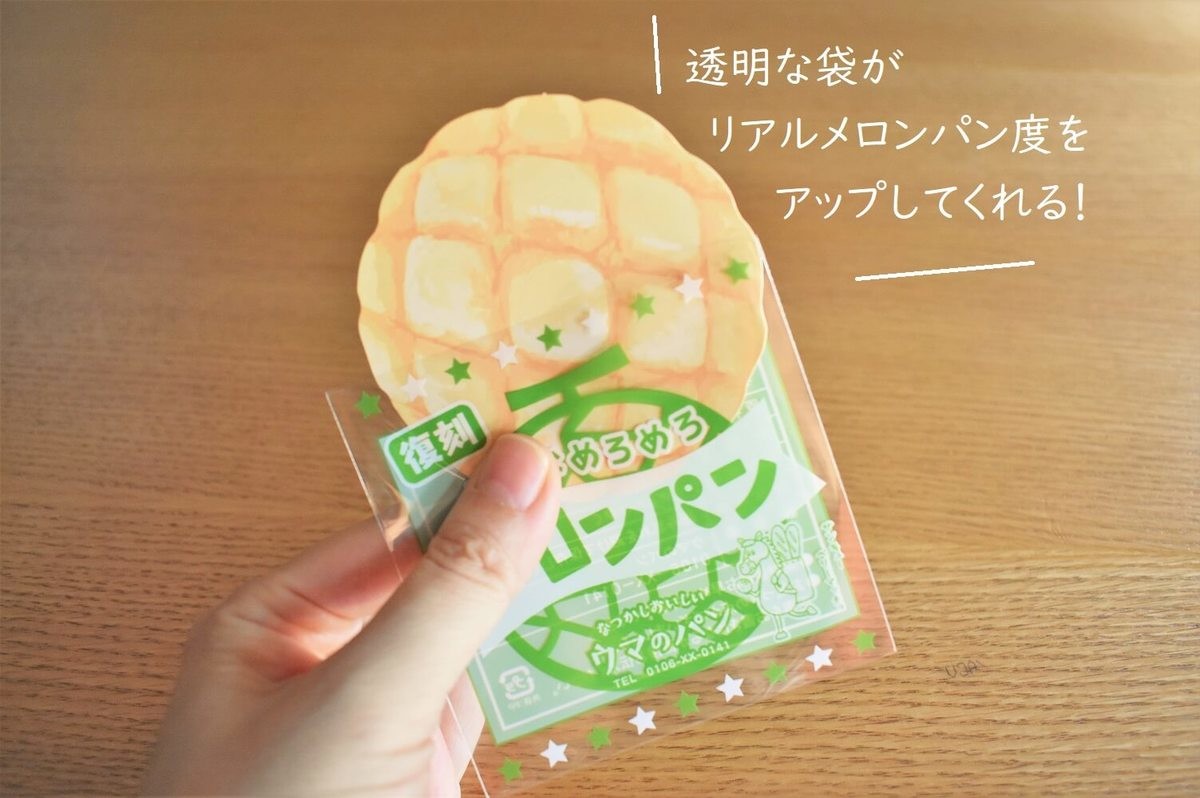 こちらは出来上がった状態の、「メッセージカード・ウマのパンシリーズ(メロンパン)」です。こちらもメロンパンの他に、あんぱん、クリームパン、カレーパンと合計4種類あります。すべて同じような透明な袋が付いています。本物のパンみたいでかわいい!