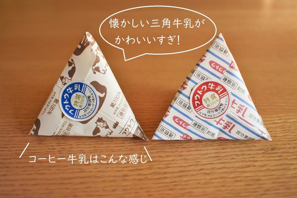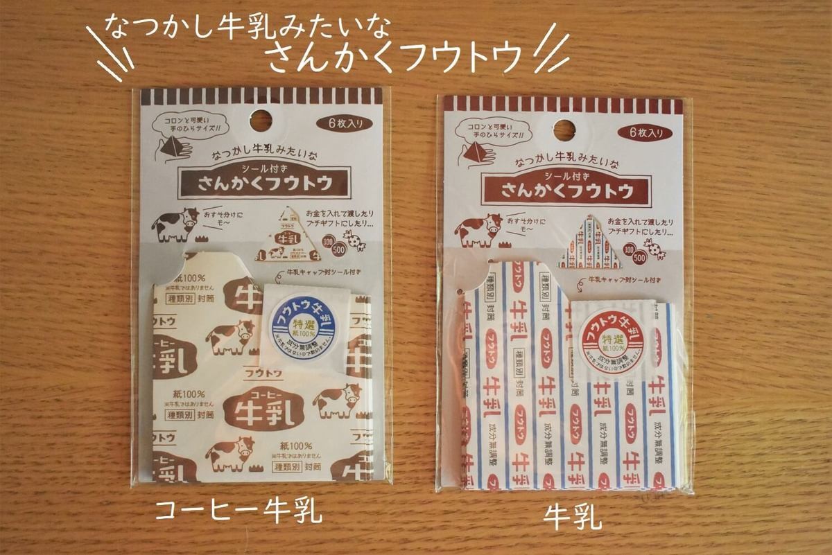 こちらがセリアの「さんかくフウトウ」シリーズです。コーヒー牛乳と普通の牛乳の2種類があります。