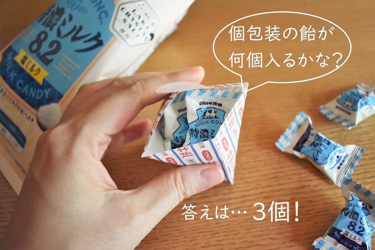 さて、この三角牛乳の封筒、思ったより大きく、しかし形状的に手紙は入れにくい(笑)という特徴があります。これは…ちょっとしたお礼に「飴」をプレゼントするのに重宝するのでは……と、ちょうど手もとにあったミルク味の飴を入れてみました。