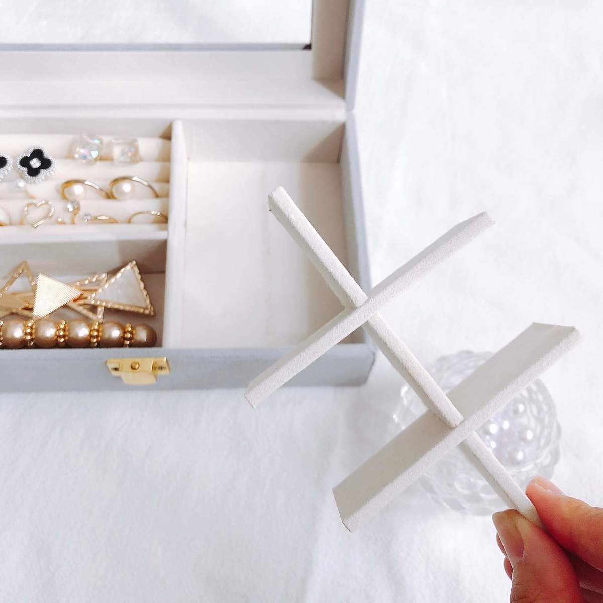 仕切りを外せば収納スペースが広がるので、ネックレスや長めのピアスなど「大物アクセサリーの収納」に最適!