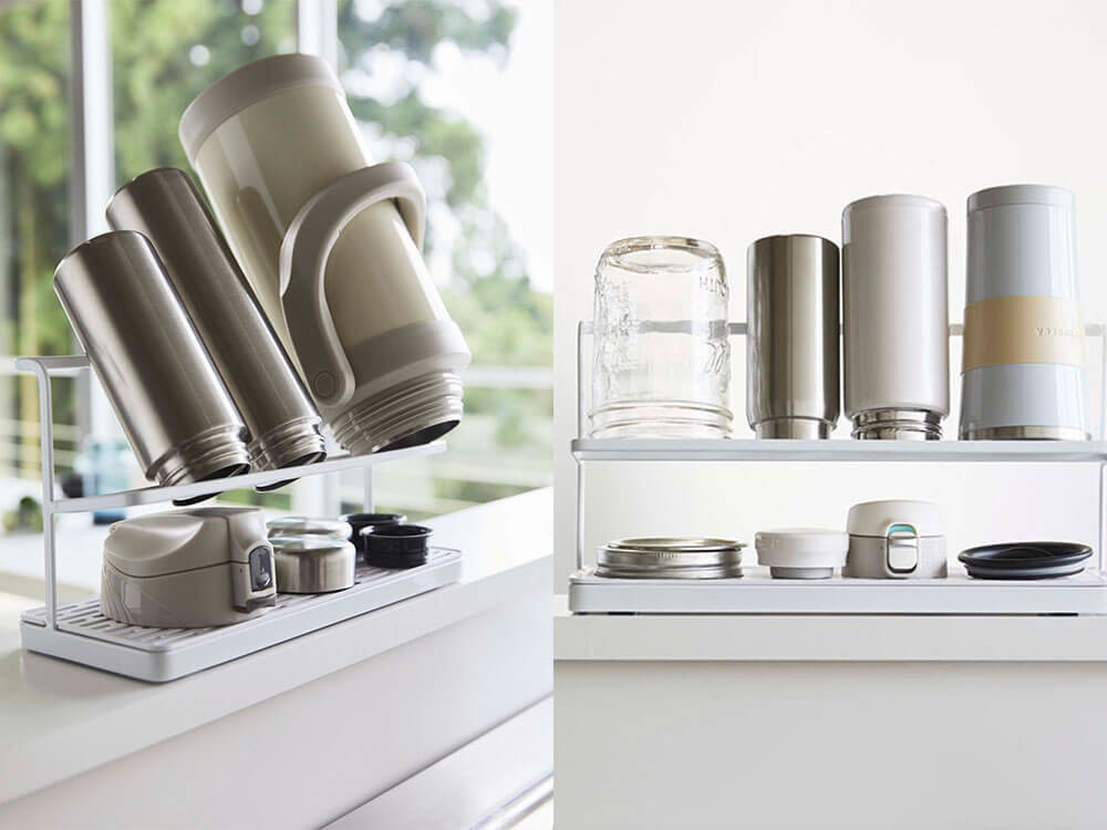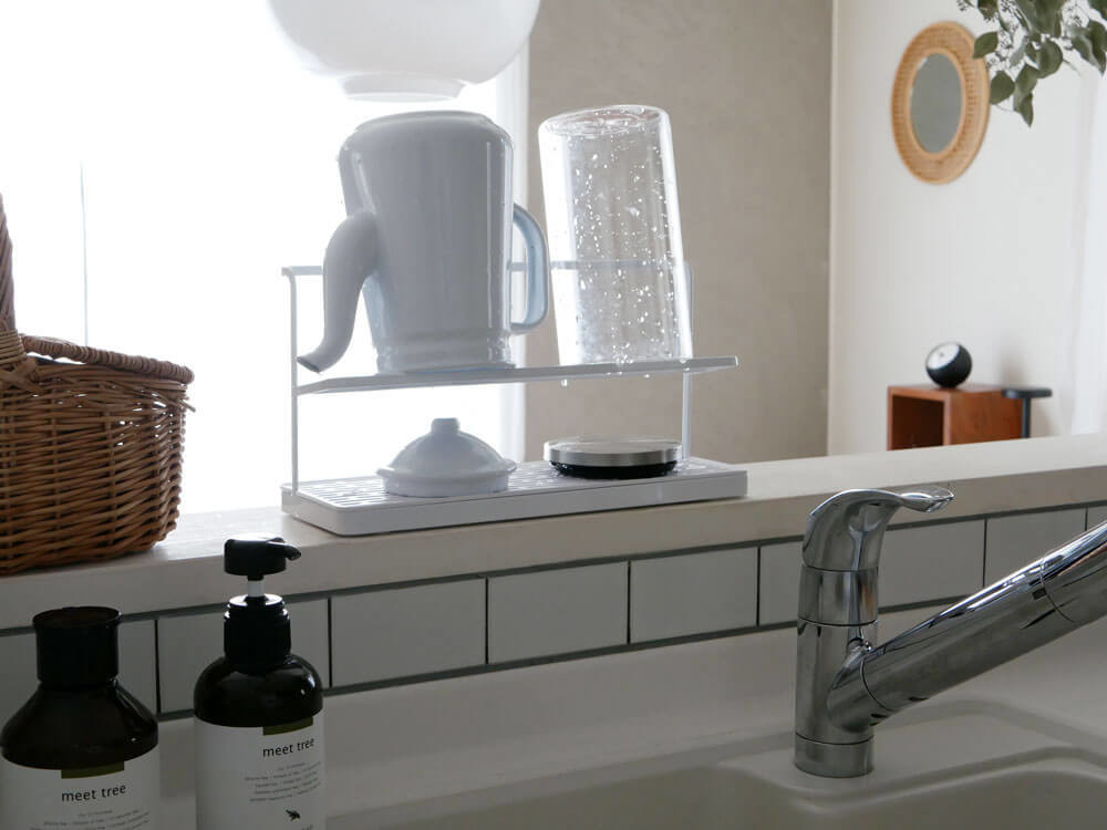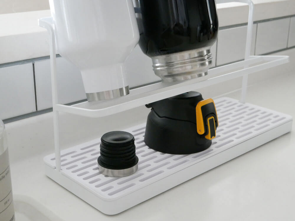 大きい水筒と小さい水筒を横並びで置けるので、しっかりと整理整頓されたシンク周りで気分もすっきりと気持ちがいいです。