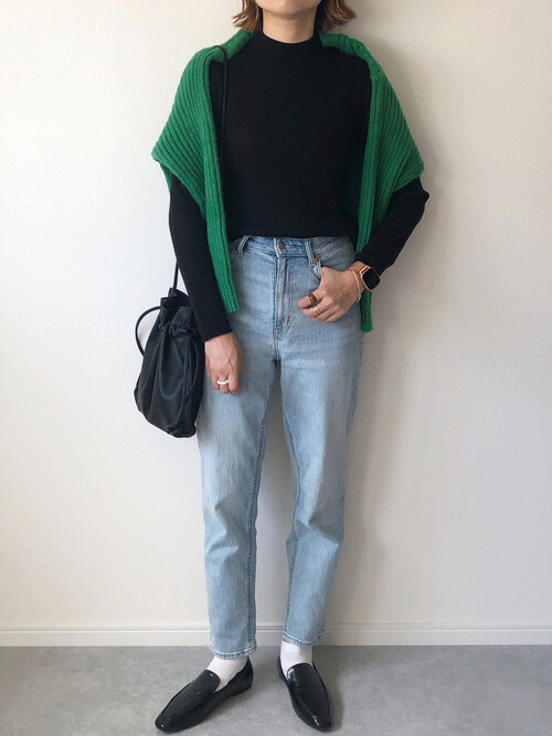 グリーンのニットを肩掛けして、アクセントを加えて。