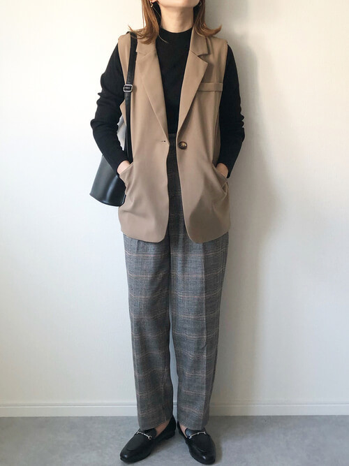 ブラック×ベージュのテーラードベスト×チェックパンツ