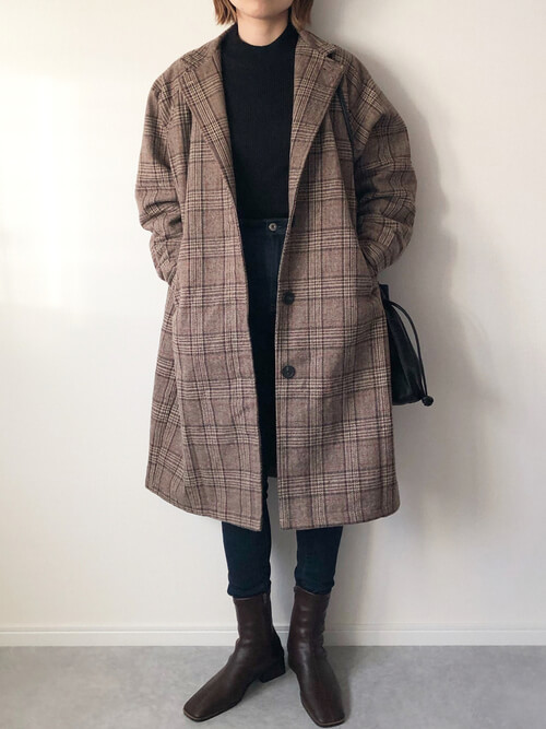 リブハイネックセーターに、秋冬らしいチェックのコートを羽織ったマニッシュコーデ。