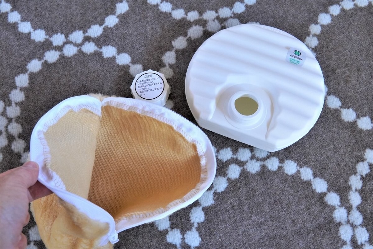 70℃以下のお湯を、湯たんぽの口元まで入れてキャップを閉め、カバーに入れるだけ。