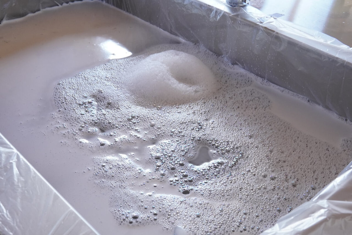 つけ置き洗い袋は袋状になっているので、シンクにかぶせて周りをマスキングテープでとめ、水をためます。