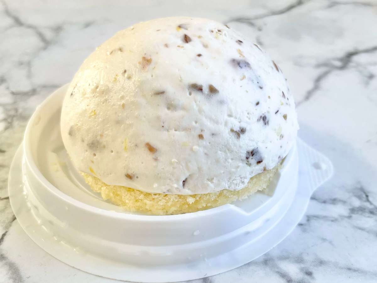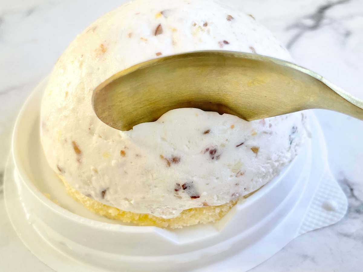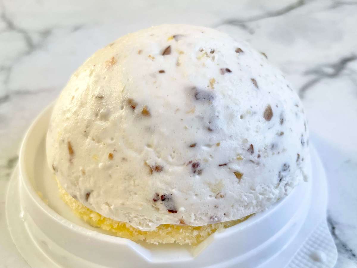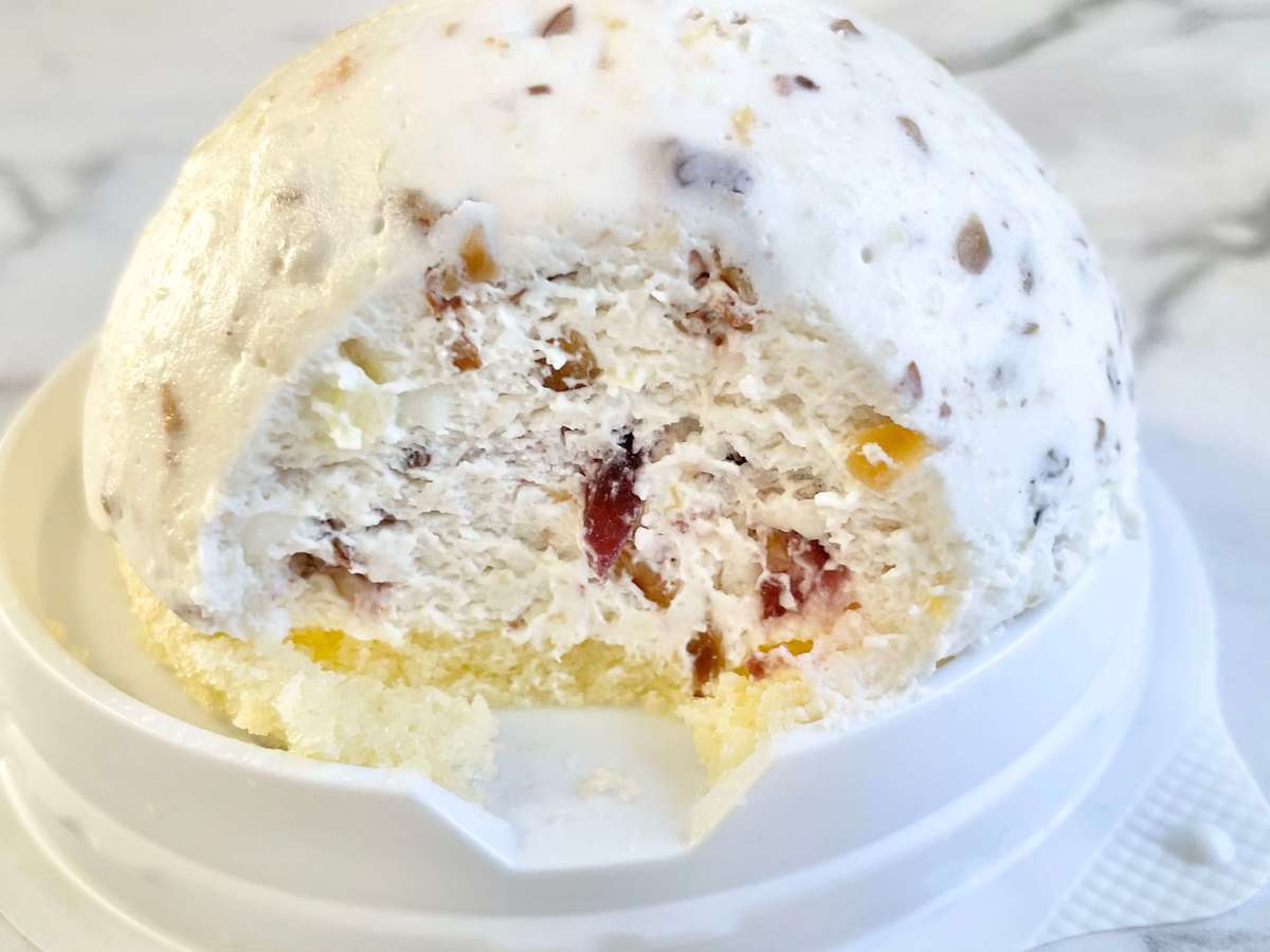 セブンイレブンのカッサータは、レアチーズムースにドライクランベリー、オレンジピール、ローストアーモンドを混ぜてドーム状に作られています。