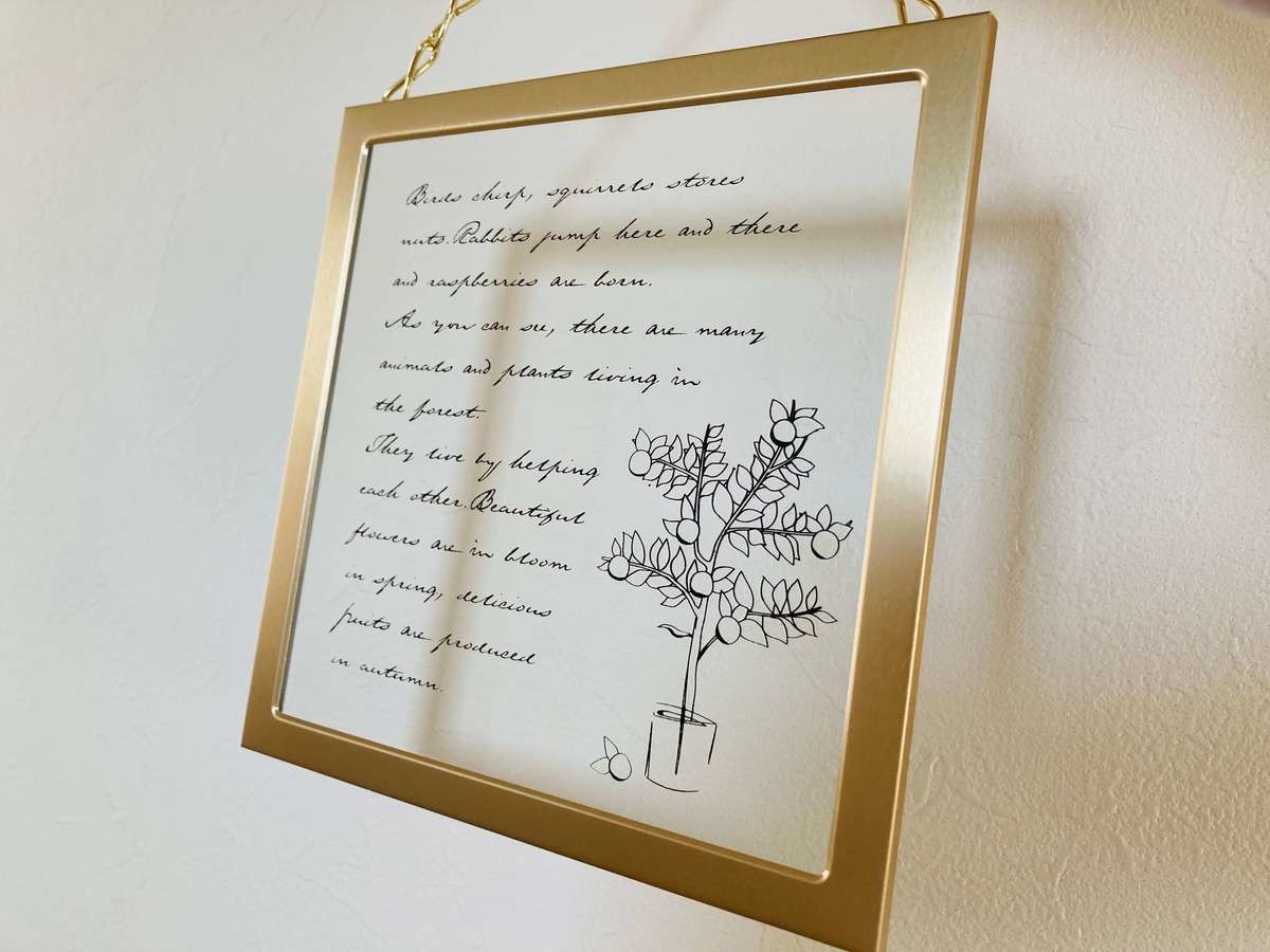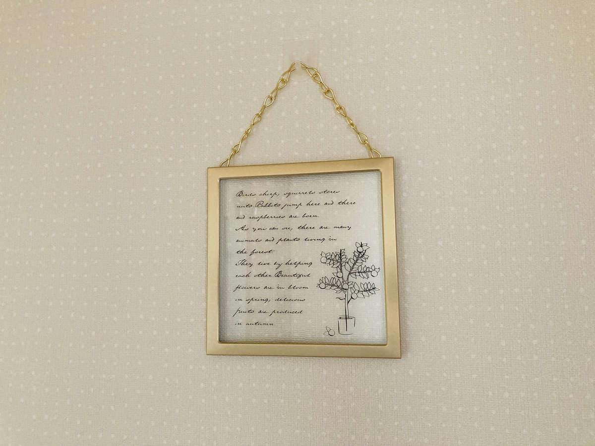 ゴールドのフレームにガラスプレート、おしゃれなイラストと可愛いが詰まっています!しかも価格は110円。ダイソーさんの太っ腹ぶりがうかがえます。