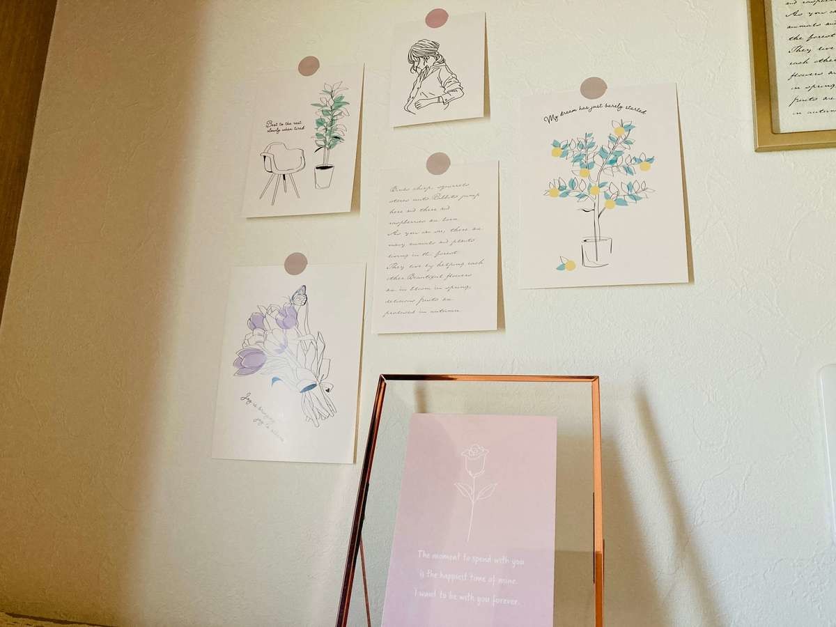 紹介したアイテムでコーディネートしてみました。フォトフレームを置いてカードを壁に貼っただけですが、素敵な韓国風インテリアになりました!