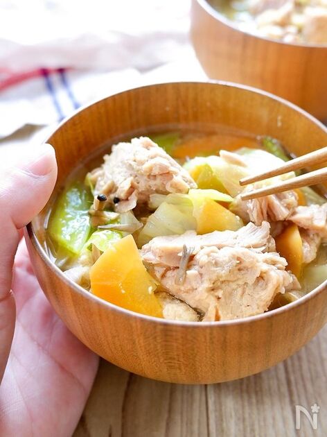 鶏もも肉と旬野菜がたっぷりおいしく食べられるボリューム満点の味噌汁。2種類の出汁と酒粕を入れるのがポイント。鶏肉以外は具材のアレンジ可能なので、冷蔵庫の残り野菜整理にも便利です。
